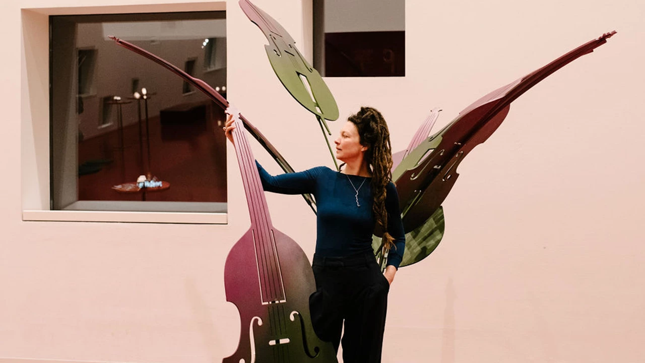 Bijschrift: Ontwerpster Tessa Verbei en een decorstuk voor de Instrumententuin (Foto Michèle Giebing)